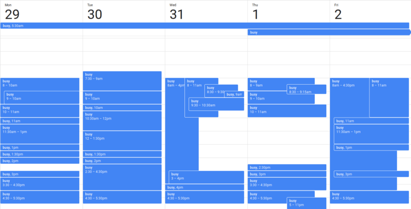 Now, this is only one week. I need more data to be able to make a more accurate view, but my hypothesis is that anything above about 40% completely exhausts me. It’s also true that I don’t know the ins and outs of this DD’s diary — maybe each slot there represents a unique piece of work, and not a meeting.