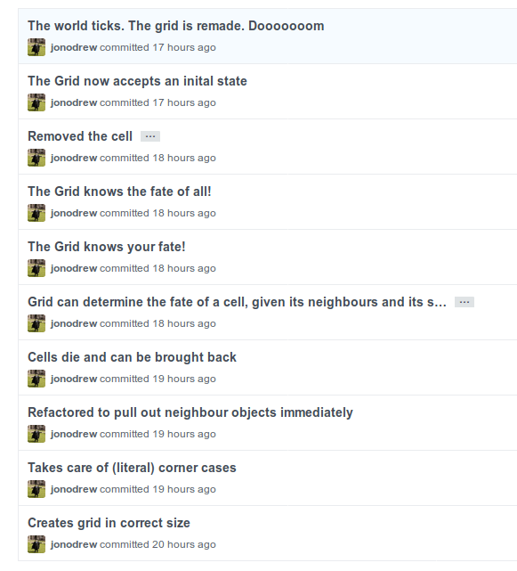I enjoyed it enormously, and I got a chance to talk about the work we do and evangelise about working with us.¹ In fact I enjoyed it so much that I went home and then came up with a solution to the problem solo, with commit messages that got weirder the later it got: