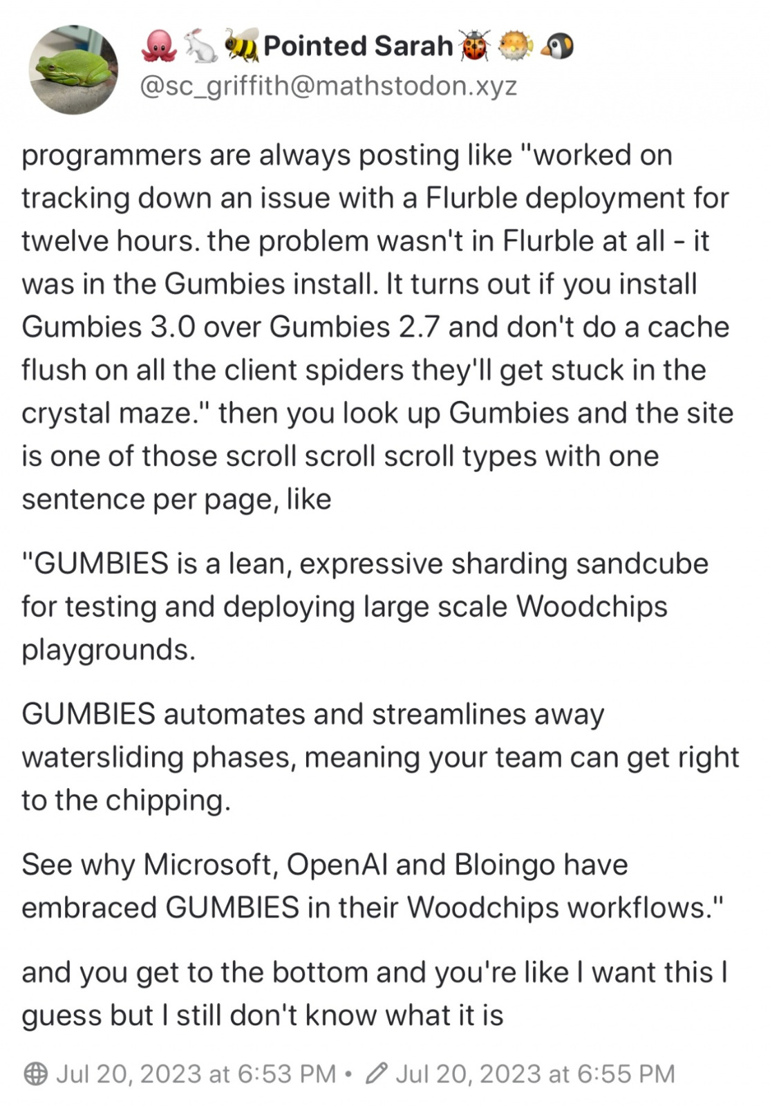 A toot from 'sc_griffith@mathstodon.xyz' that says: programmers are always posting like "worked on tracking down an issue with a Flurble deployment for twelve hours. the problem wasn't in Flurble at all - it was in the Gumbies install. It turns out if you install Gumbies 3.0 over Gumbies 2.7 and don't do a cache flush on all the client spiders they'll get stuck in the crystal maze." then you look up Gumbies and the site is one of those scroll scroll scroll types with one sentence per page, like